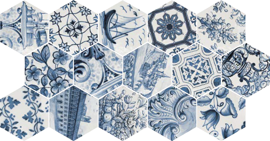 орнаментальное напольное покрытие в стиле пэчворк, 20 вариантов орнаментов; керамический гранит, в упаковке 35 штук или 1 кв.м, вес упаковки составляет 18,6 кг
