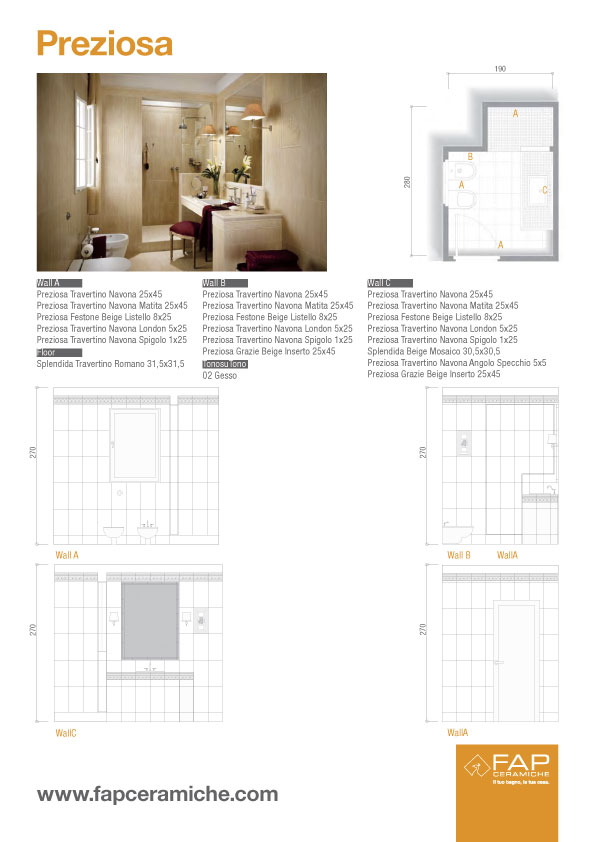 С керамической плиткой Preziosa от Fap Ceramiche ваша ванная комната роскошная, очарование и красота мрамора с мягким текучим движением прожилок, придает ей безграничные эмоции. Ректифицированный формат 25х45 при укладке образует великолепные сатинированные поверхности, создавая зрительный эффект одного сплошного пространства. Серия Preziosa выполнена в широкой гамме цветов, дополнена декорами, мозаикой и специальными функциональными элементами, позволяющими скоординировать пространство ванной комнаты с вашей индивидуальностью.