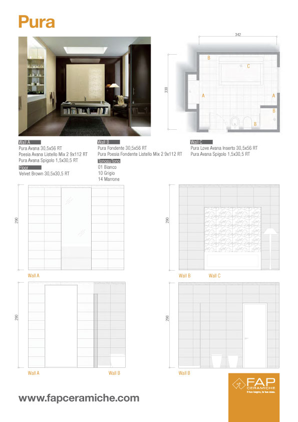 Pura совершенно, если так можно выразиться, классическая коллекция керамической плитки для ванной комнаты Фап, только современная, отфильтрованная, учитывая вкус, время и современные технологии. Удлененный формат плитки 15х56 и ее ректифицированные края представляют собой очень актуальную и популярную интерпретацию классики без времен. Fap раскрывает в современном ключе самую классическую форму керамики, прямоугольник с гранеными краями в форме алмаза. Формат 15х56 Diamante можно комбинировать с форматом 30,5х56 Pura, в монохромии или с конрастом цвета.