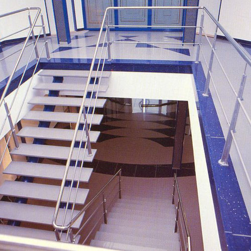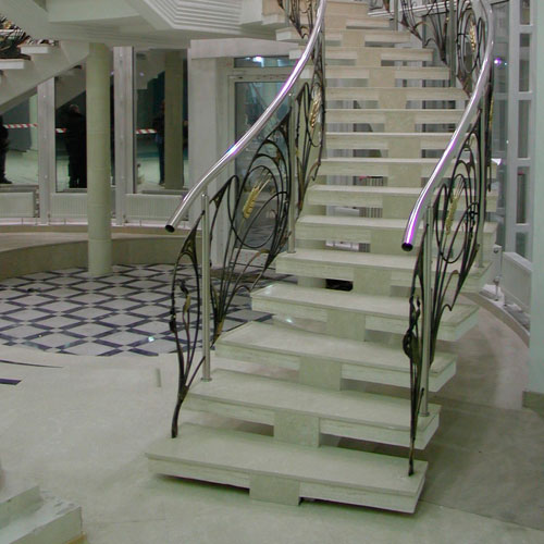 Ступени лестниц можно изготавливать из кварцевого (кварцит) и мраморного (агломрамор) агломерата. Кварцит - более прочен, агломрамор мягче и напоминает натуральный мрамор по цвету и эксплуатационным характеристикам. Ступени из кварцевого агломерата способны выдерживать большие нагрузки, поэтому их часто используют в помещениях с высокой проходимостью. Поверхность кварцевого агломерата даже через продолжительное время остается неизменной – ей не страшны царапины. Но для безопасности на ступени можно нанести специальные насечки против скольжения.