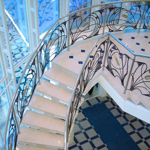 Для наружных лестниц, в основном, используется кварцевый агломерат, а для внутренних – агломрамор. Ступени могут быть изготовлены из слябов (разного размера и формы) или из плитки. Толщина ступеней меняется в зависимости от предполагаемой нагрузки. Торцы ступеней из кварцевого агломерата можно полировать.